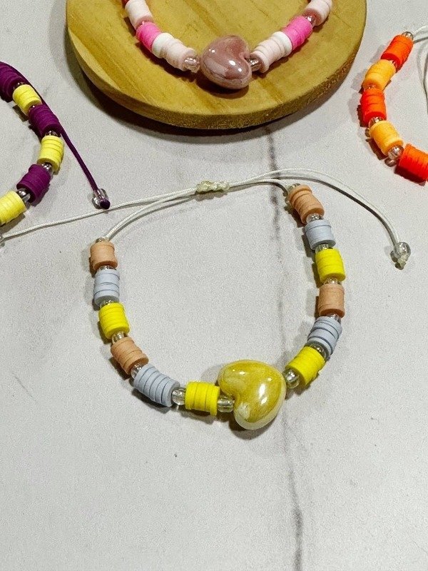 Pulsera de hilo chino, fimo, mostacillas y dije de cerámica
